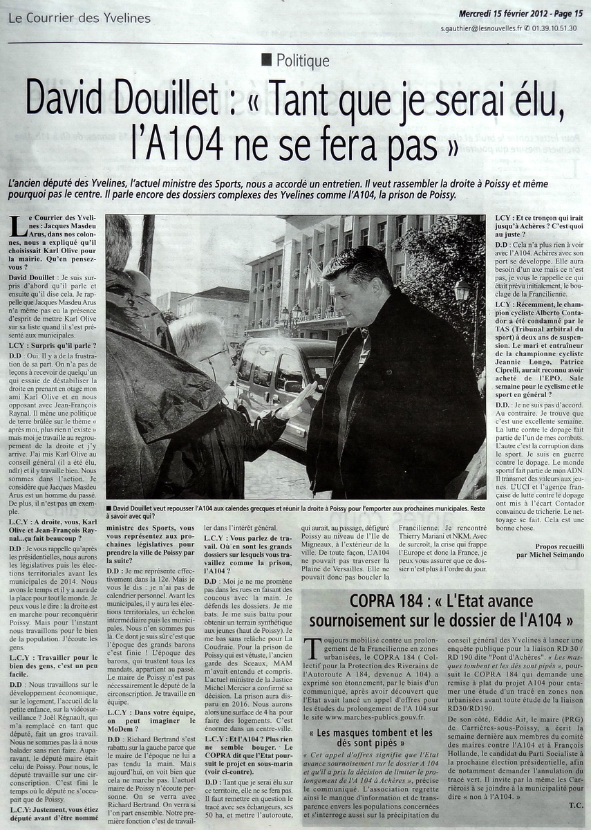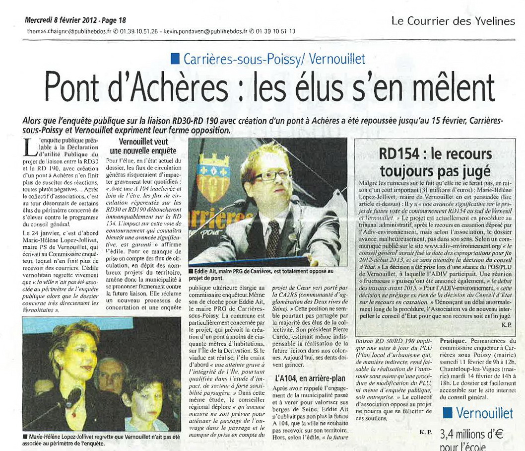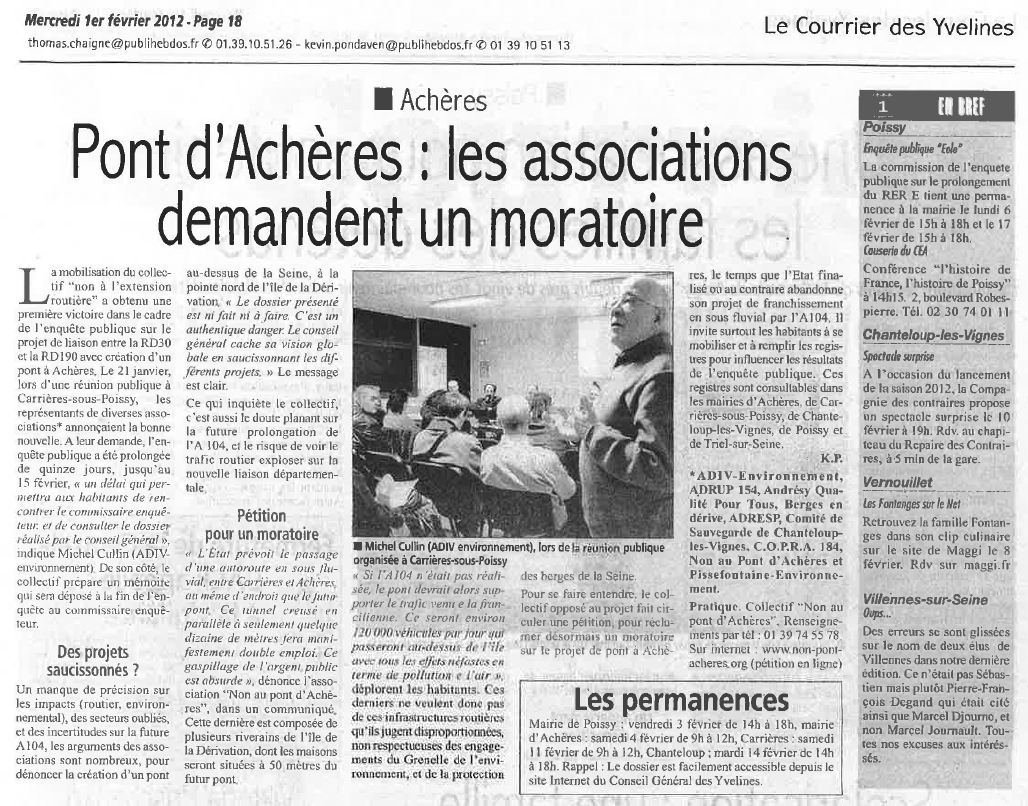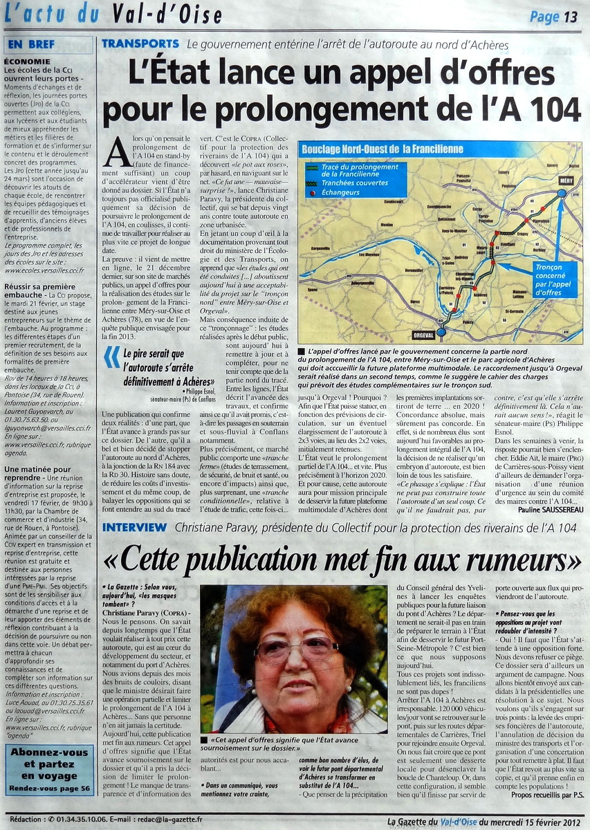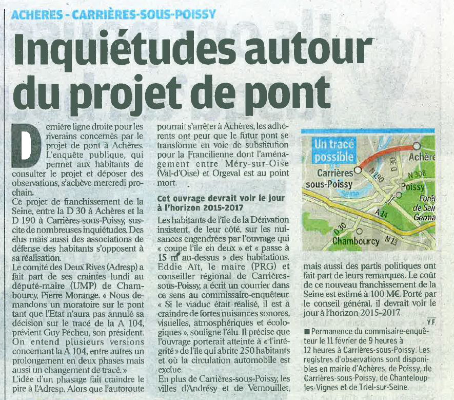 - La presse locale se fait largement l'écho de notre dernier communiqué du 10 février 2012 que nous avons publié afin de révéler l'appel d'offre lancé par l'Etat pour la réalisation des études du prolongement de la Francilienne A 104 de Méry-sur-Oise à Achères en vue de l'enquête publique.