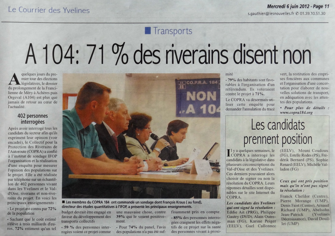 Suite à la conférence de presse CO.P.R.A. 184 / IFOP du 1er juin 2012, les médias ont largement repris les résultats du sondage sur l'A 104 effectué par l'IFOP au mois de Mai.