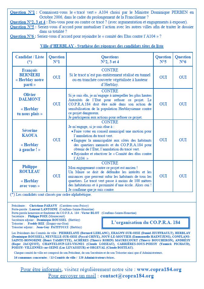 Le Comité de Ville CO.P.R.A. 184 d'Herblay vous présente la synthèse des réponses obtenues des candidats têtes de listes aux Élections Municipales des 23 et 30 mars 2014.