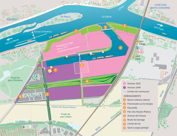 - Le secteur Ouest - PSMO - de 120 hectares qui fera face aux villes de Conflans-Sainte-Honorine et d'Andrésy, plus spécialement destiné à l'exploitation des granulats de la plaine d'Achères et à leur acheminement pour la construction du Grand Paris mais aussi à la réception des produits de déconstruction en vue de leur concassage.