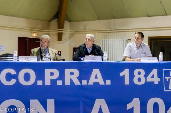 Philippe POIX, Secrétaire du CO.P.R.A. 184 et Dominique ROUSSEL, Président de séance et Secrétaire Adjoint du CO.P.R.A. 184, donnent lecture pour chaque ville, de la liste des candidats administrateurs devant être élus pour former le conseil d'administration du CO.P.R.A. 184 pour l'exercice qui commence, au titre de l'article 11 des statuts.