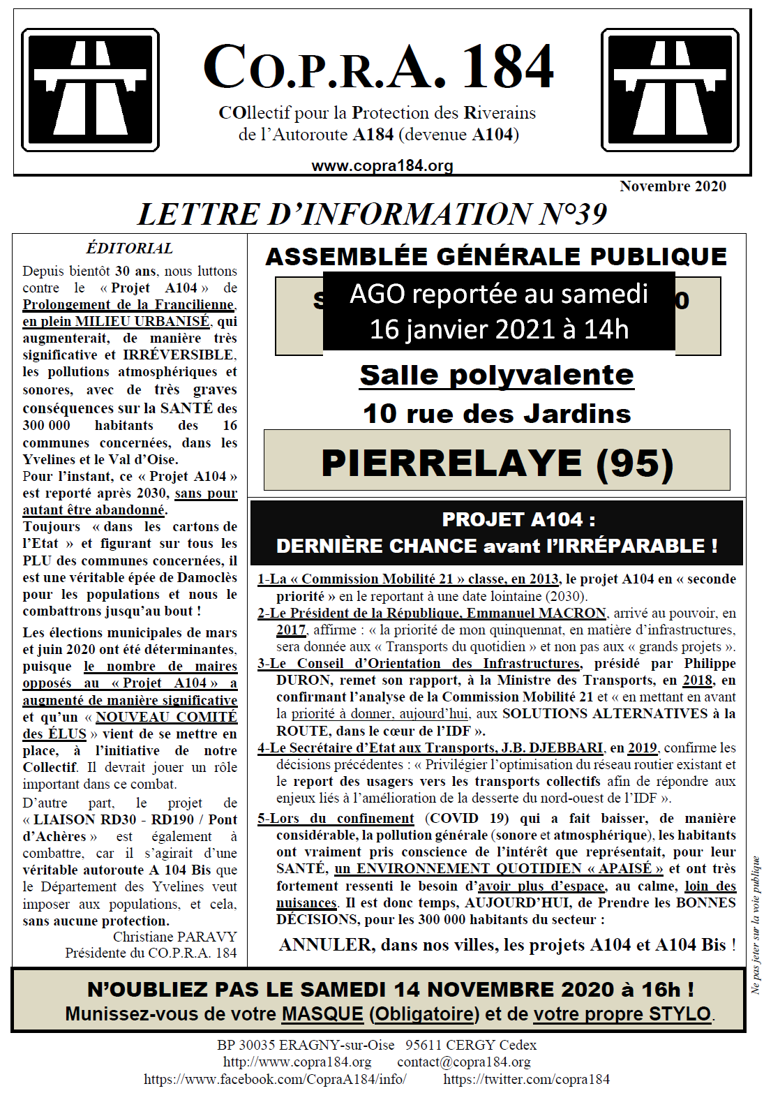 Les élections municipales de mars et juin 2020 ont été déterminantes, puisque le nombre de maires opposés au « Projet A104 » a augmenté de manière significative et qu’un « NOUVEAU COMITÉ des ÉLUS » vient de se mettre en place, à l’initiative de notre Collectif. Il devrait jouer un rôle important dans ce combat.