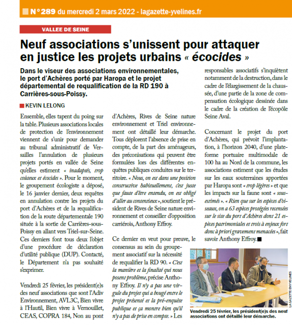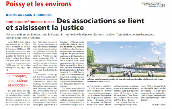 Les recours juridiques contre la DUP de PSMO (Port d'Achères) et contre la DUP de la requalification de la RD190 sont repris dans la presse à la suite de notre conférence de presse du 25/02/2022. Nous donnons ci-après copie de ces articles de presse.