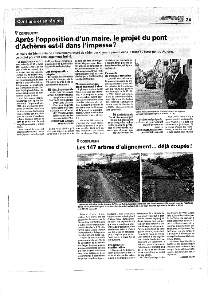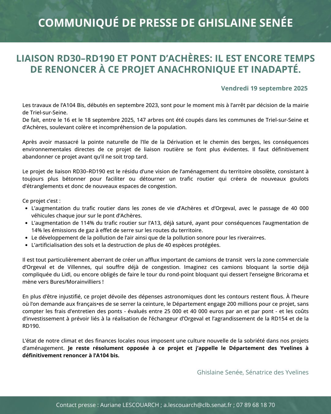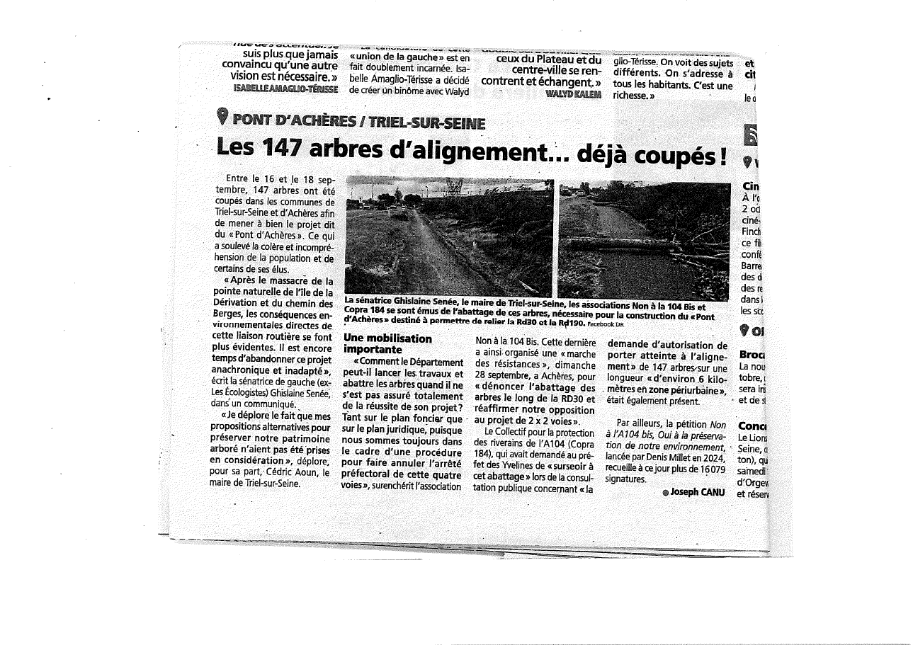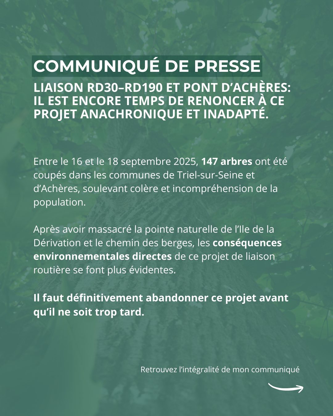 Suite aux déclaration du maire de Triel-sur-Seine concernant le refus de rétrocession des chemins communaux de la commune de Triel-sur-Seine concernant le projet de liaison 2x2 voies RD30/RD190 Pont d'Achères, les associations ont envoyé le communiqué de presse ci-joint.