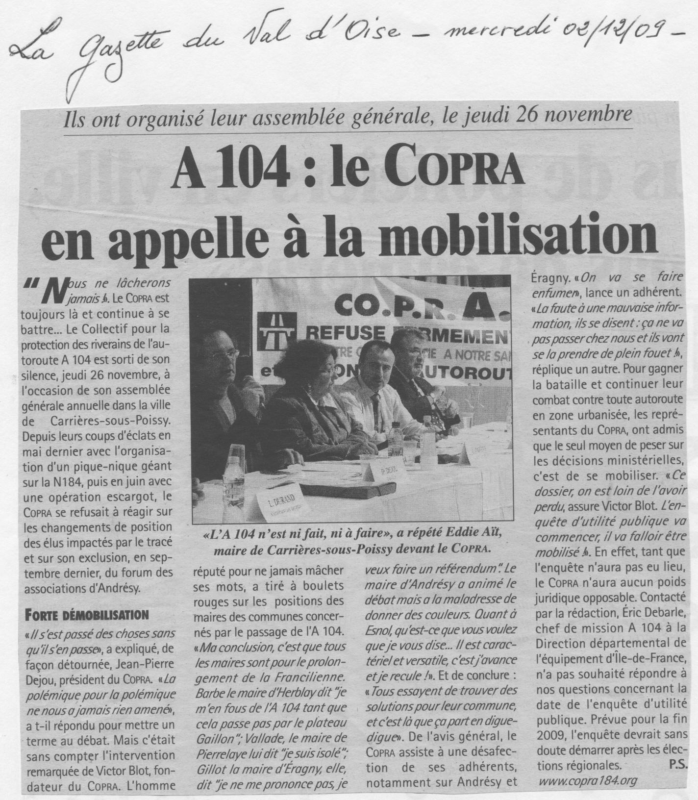 Suite à l'Assemblée Générale Ordinaire du CO.P.R.A.184, qui s'est déroulée dans une salle comble, à l'Espace Louis Armand, à Carrières sous Poissy, le jeudi 26 novembre 2009, vous trouverez, ci-dessous :