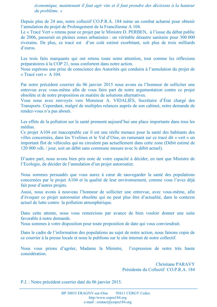 Nous sommes persuadés que vous aurez à cœur de sauvegarder la santé des populations concernées par le projet A104 et la qualité de leur environnement, comme vous l’avez déjà fait pour d’autres projets.