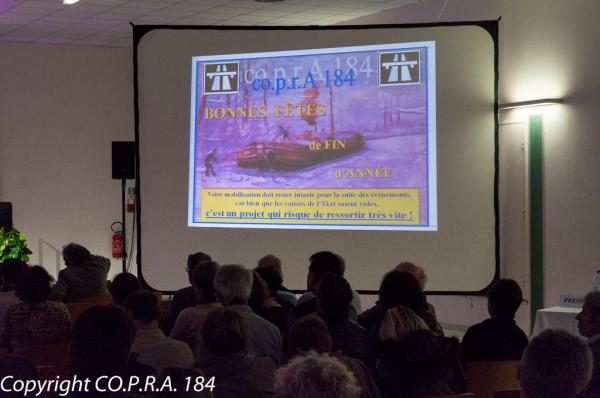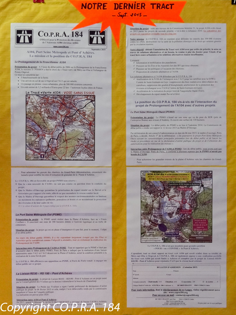 Des panneaux d'information préparés par Christiane PARAVY, Présidente du CO.P.R.A. 184 et rassemblant cartes du tracé vert, articles de presse, lettres d'information du COPRA 184 et communiqués de presse etc., sont disposés à l'entrée de la Salle des Fêtes, pour permettre aux participants de revoir ce qui a fait l'actualité de ce projet en 2015.